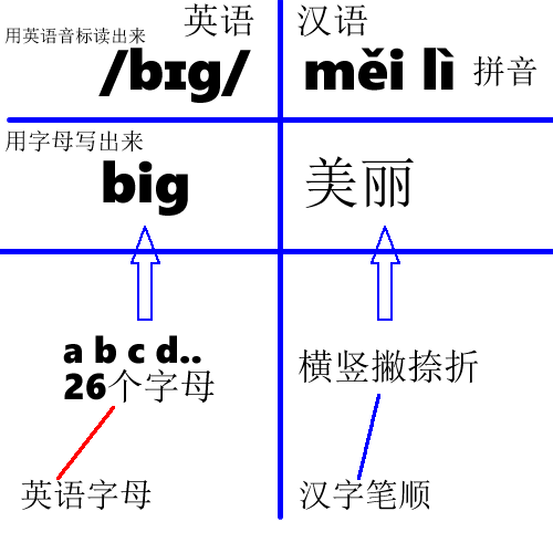 就如同汉语里的拼音,当你看到“天”这个字,就知道它发音是tian。可以简单地用“汉语拼音”来理解英语音标,下面这张图解释了两者的对照关系: