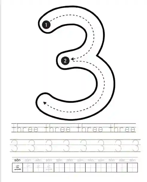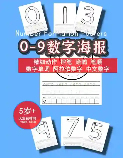 0-9数字海报pdf版本,带有控笔、英语单词和和汉字控笔、笔顺练习,A4pdf打印。